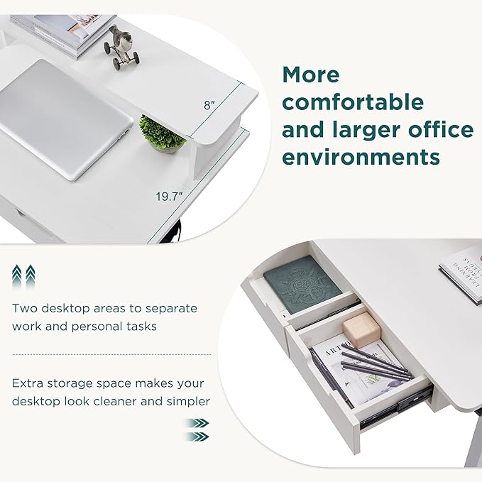 - More intimate design: The computer desk has several convenient features. It has built-in power outlets, allowing easy charging of devices such as laptops and smartphones. On both sides of the desk, handy hooks are provided for hanging items, keeping your essentials within reach. The desk also features a 360-degree rotating cup holder, ensuring you can enjoy your beverages without worrying about spills. Additionally, it comes with a keyboard tray, providing a designated space for comfortable typing. Lastly, the desk offers two drawers for storing small items, helping you organize your workspace.