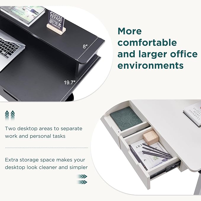 - Spacious Workspace: the monitor shelf provides a comfortable height and better control of the distance from your eyes and the angle of the screen. The under-shelf store's office supplies and displays decorative items without compromising your workspace. 75 * 60 inches allows you to use one part as your office area and the other part as your study and entertainment area