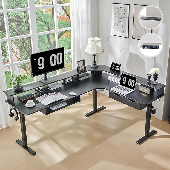 RedLemon 75X60 Inches L Shaped Electric Standing Desk, Height Adjustable Corner Gaming Desk with Drawers, Power Outlets & LED Lights, Computer Desk with Monitor Shelf, Carbon Fiber Black