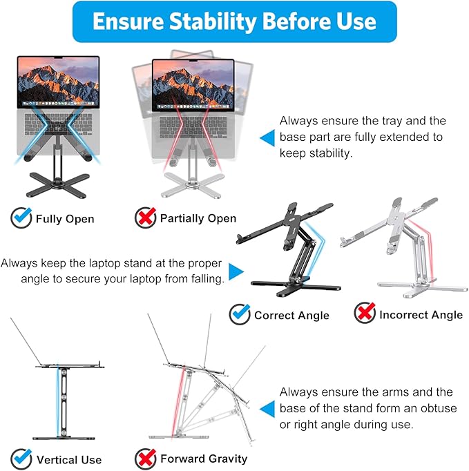 - 【Broad Compatibility】: The laptop stand for desk is well compatible with all laptops from 11 to 16-inch, such as MacBook 12 inch/ 13 inch, MacBook Air 13 inch, MacBook Pro 13 inch / 15inch/ 16 inch (2021/ 2020/ 2019/ 2018/ 2017/ 2016), Microsoft Surface, Dell, HP, Chromebook, and other devices