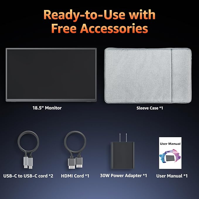 - [Large portable monitor, Lightweight and Frameless]: Experience larger viewing with this 18.5 inch 1080P FHD IPS screen, featuring a 4-side frameless design, ideal for multitasking and detailed work. Weighting just 2.24 pounds, 0.25-inch minimun thickness and 0.49-inch maximun thickness, making it easy to carry for professionals on the move and compact workspaces.