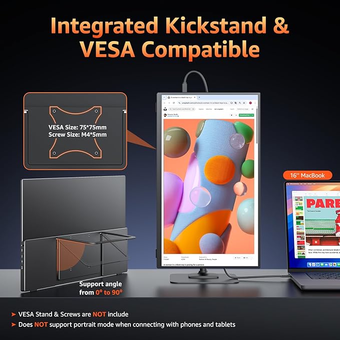 - [Travel Monitor with Built-in Kickstand, VESA Compatible]: The adjustable built-in kickstand offers convenient viewing angles and makes it perfect for travel. With a Standard 75×75mm VESA mount, you can easily attach this portable screen to a monitor stand—helping you save valuable workspace while maintaining flexibility.