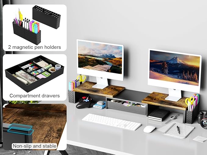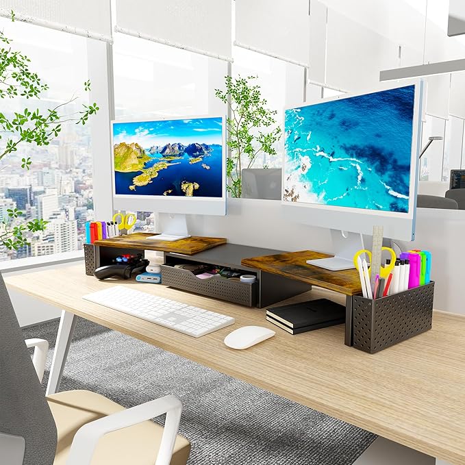 - Dual-screen office efficiency improvement: This desktop organizer is equipped with a dual-display stand, which can place two monitors at the same time, effectively expanding the workspace. It also has adjustable length (27.6-40.6 inches) and angle to provide you with a better viewing experience.