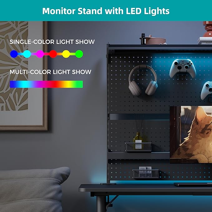 - ▶Personalize Your Space: The metal pegboard panels come with accessories and LED lights, allowing you to freely customize your workspace. The included headphone hook, baskets, and top shelf will make your workstation more efficient. The standard pegboard holes allow you to add as many accessories as you like for extra storage space. Elevate your environment with customizable RGB lighting options, offering 6 vibrant colors and dynamic modes for a personalized ambiance.