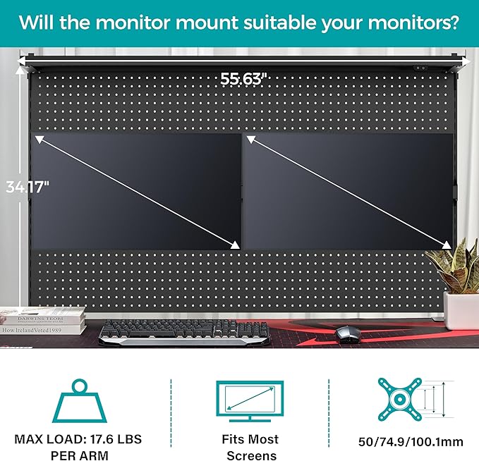 - ▶Ergonomic Dual Monitor Support: Elevate your work experience with our steel pegboard featuring dual-monitor stands designed for comfort. Enjoy the flexibility of 360° swivel, tilt, and rotation, allowing you to tailor your monitor positions and heights to your preference. VESA compatibility for sizes 100x100, 75x75 mm, or 50x50mm. Maximum load per arm 17.6 LBS.