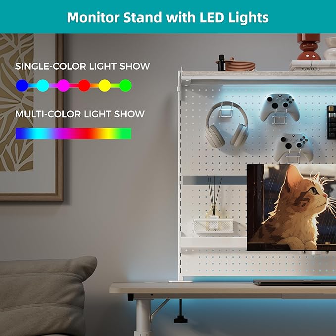 - ▶Personalize Your Space: The metal pegboard panels come with accessories and LED lights, allowing you to freely customize your workspace. The included headphone hook, baskets, and top shelf will make your workstation more efficient. The standard pegboard holes allow you to add as many accessories as you like for extra storage space. Elevate your environment with customizable RGB lighting options, offering 6 vibrant colors and dynamic modes for a personalized ambiance.
