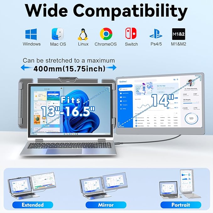 - ⚡️【Boost Your Productivity By Up to 200%】:The dual laptop monitor extender offers multiple display modes, including extended, mirrored, and portrait modes. Supports you to open multiple windows at the same time, work, video conference, watch movies, or play games on different screens by not having to switch back and forth on a single laptop screen continuously, increase your efficient by up to 200%. Perfect for people who work on the go, remote workers, watch a movie,IT professionals, Players, Stock traders, Programmers, game players, etc!