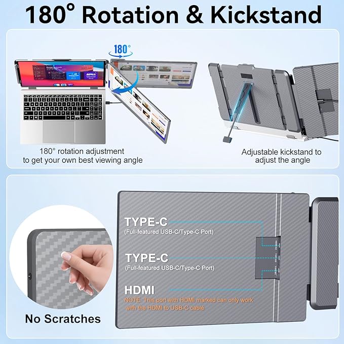 - 📟【Broad Compatibility & Personalized Design】This portable laptop screen extender can work with almost all laptop which has full-featured USB-C port(support charge and video transmit) or HDMI port, offering broad compatibility with Windows, Chrome, Mac, Android, Linux, Dex, PS4, Xbox, and Switch. The dual monitors boast a scratch-free back panel design, can remain brand new even used for a long time.