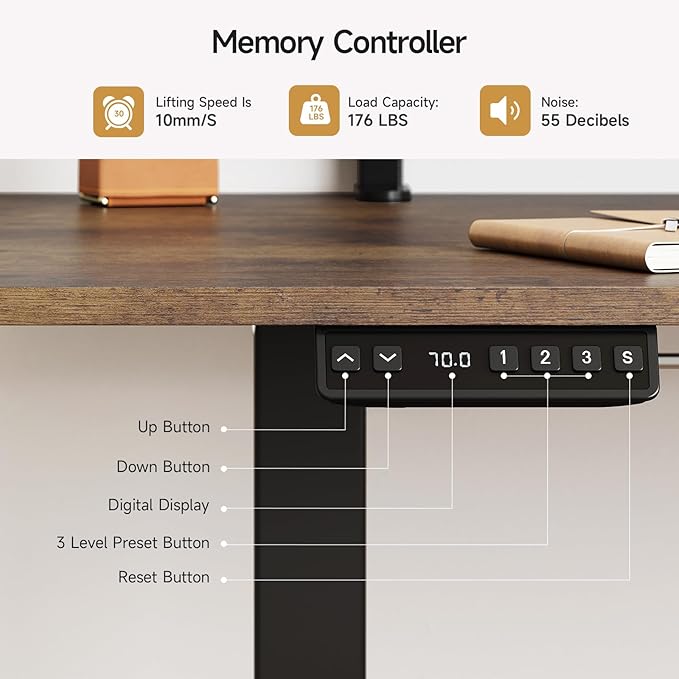 - Memory Controller: The standing desk features 3 preset buttons to customize your desired height, allowing for seamless transitions between sitting and standing throughout the day. Our sit-stand desk comes with 1 headphone hook and 1 cup hanger to keep your desk organized, making it easy and convenient.