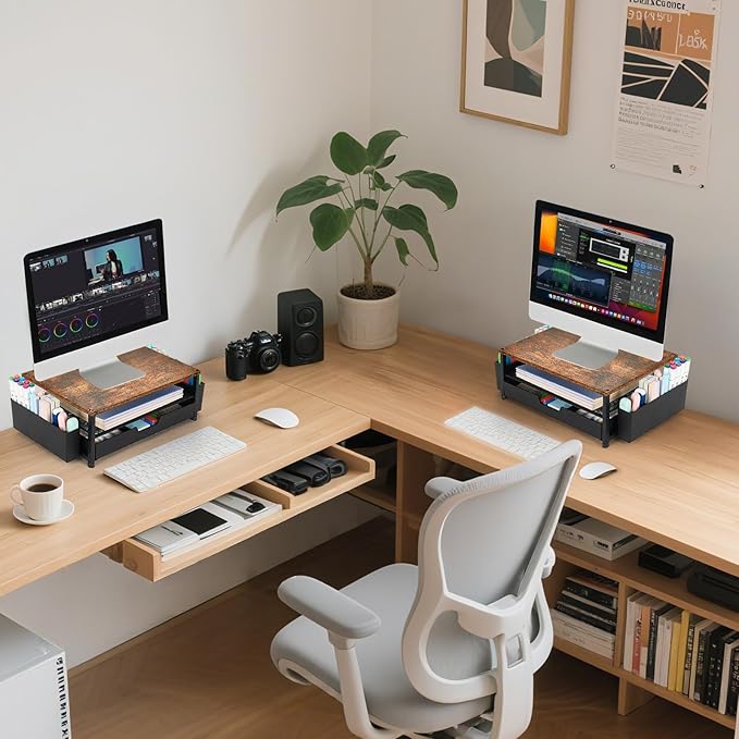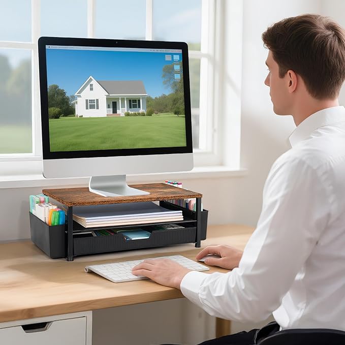 - 【Ergonomic Eye-Level Comfort 】Elevate your screen to the perfect eye level to eliminate neck strain and slouching. ECOLOVI desk organizer monitor stand promotes a healthier posture, reducing fatigue during long hours of work or studying, so you can stay focused and productive all day