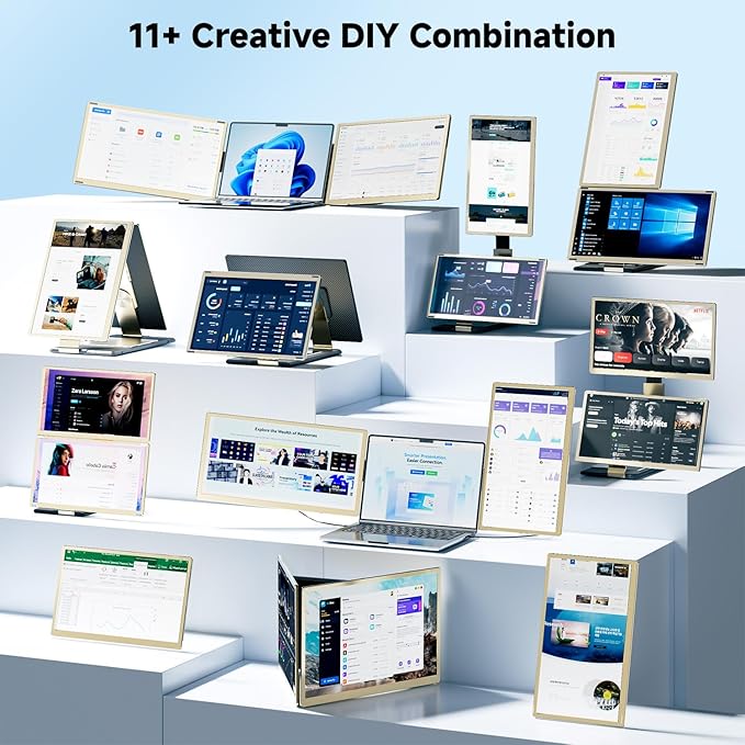 - 💻【Plug n Play Detachable DIY Screen Extender 】:This detachable triple screen extender can rotate both horizontally and vertically, offering over 11 DIY configurations. Whether you need a triple screen setup for multitasking or prefer a dual screen for focused tasks, this screen extender can easily meet your needs. Whether you choose a USB-C or USB-A add HDMI cable, simply plug in laptop to start using it, with no need for any drivers. Turning your laptop into a dynamic workstation!