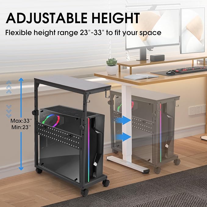 - FIT FOR MOST PC CASES: The Tower Stand features 5-gear manual height adjustment, ranging from 23'' to 33'', and is compatible with most ATX and computer cases. Customize the height of the pc case stand and choose the appropriate distance between the computer tower and the top rack to speed up heat dissipation, and allow you to store the tower under or next to a desk as needed.