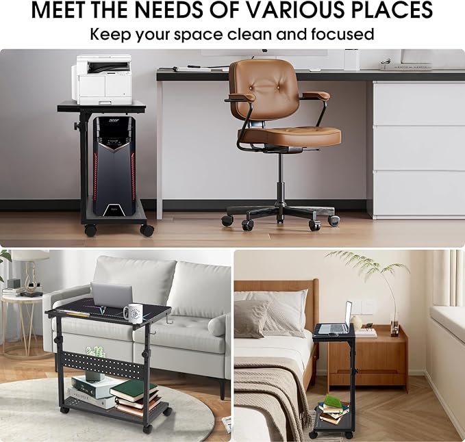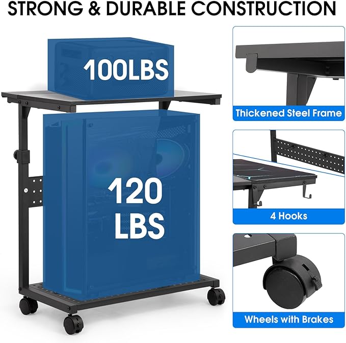 - STRONG MOBILITY: Equipped with four 360° rotating silent wheels, the computer stands cart moves smoothly and easily without scratching the floor, allowing you to move it anywhere. Easy to place, the wheels can be locked to keep your computer tower stationary when needed. Expanded Space-Saving Design:
