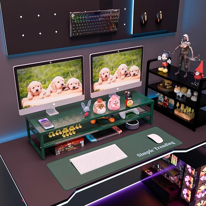 Simple Trending 2 Tier Metal Dual Monitor Stand Riser, Computer Office Desktop Organizer for 2 Monitors with 32"x10" Mouse Pad for Laptop, Printer, TV, Green