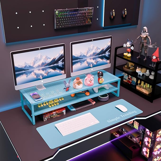 Simple Trending 2 Tier Metal Dual Monitor Stand Riser, Computer Office Desktop Organizer for 2 Monitors with 32"x10" Mouse Pad for Laptop, Printer, TV, Blue