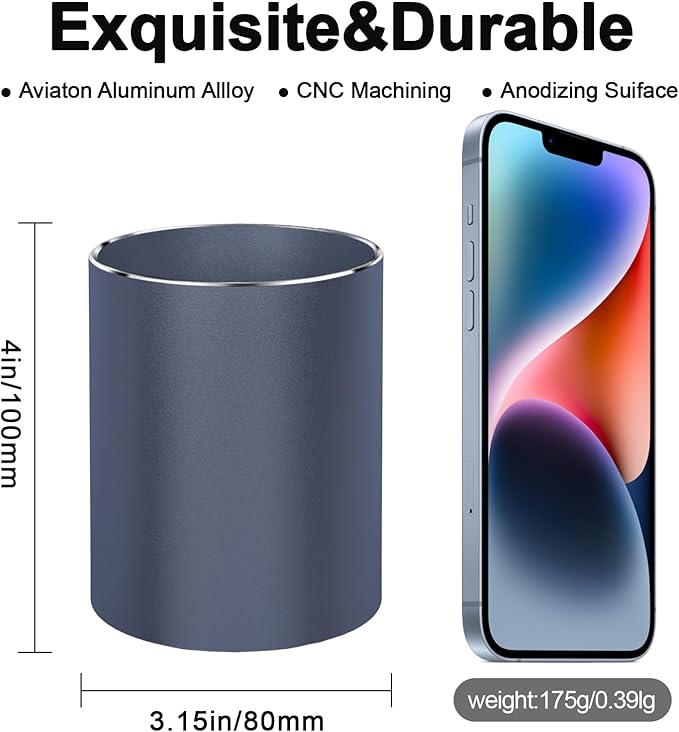 - 【HIGH QUALITY METAL】Made of high quality metal and through hard oxidation, the net weight of aluminum pen holder is 0.42lb, sturdy and durable. Unlike other plastic/acrylic pencil cups on the current market, our metal pencil holder is not easy to break, and has a longer lifespan to use. No worries about anything, if you got any problems about the product, we promised to offer a 3-YEAR WARRANTY for every customers.
