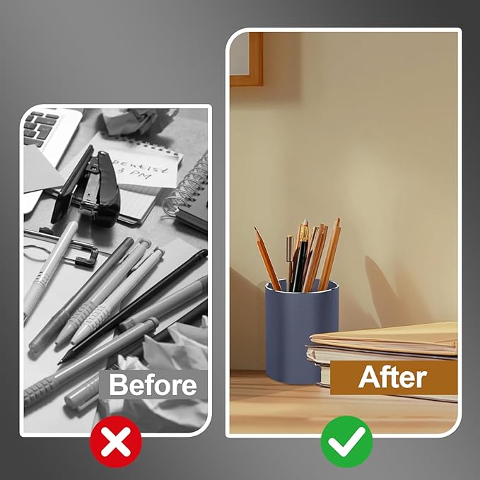 - 【MULTI-FUNCTIONAL PEN CUP TO DECLUTTER ANY DESK】In the classroom, it’s a helpful tool to declutter your desktop such as pens, pencils, highlighters, rulers and other school stationary supplies. At bathroom, you can put toothbrush and toothpaste into the pretty pen holder. At bedroom, you can also organize all kinds of makeup tools on the dressing table. With our solid waterproof pen holder, you can easily declutter any desk!