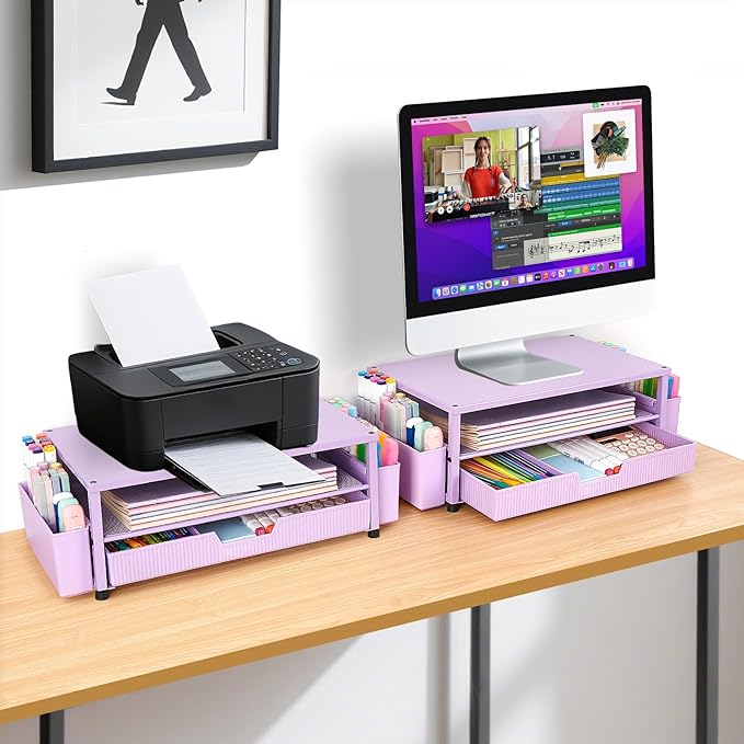 Desk Organizer and Accessories, 2-Tier Computer Monitor Stand Rise with Storage Drawer & 2 Pen Holders, Laptop & Printer Stand for Desktop, Workspace Organizers for Office Supplies (Purple)