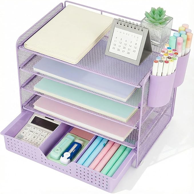 Desk Organizer and Accessories, 5-Tier Paper Letter Tray Organizer with Drawer & 2 Pen Holders for Desktop File Organization, Office Desk Accessories for Supplies Storage (Purple)