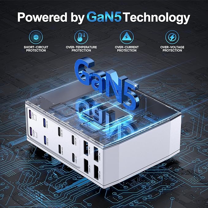 - 【Latest GaN 5 Charging Station】:GaN charger offer advantages over traditional chargers, featuring a more robust safety protection system. Utilizing IceShield 5.0 Gallium Nitride (GaN) technology, protecting against overcharging, overheating, short circuits, overcurrent, and overvoltage. Multi built-in protection systems and Advanced chips deliver more efficient charging power and lower heat generation compared to previous-gen GaN technology, ensuring device safety and extending its lifespan.