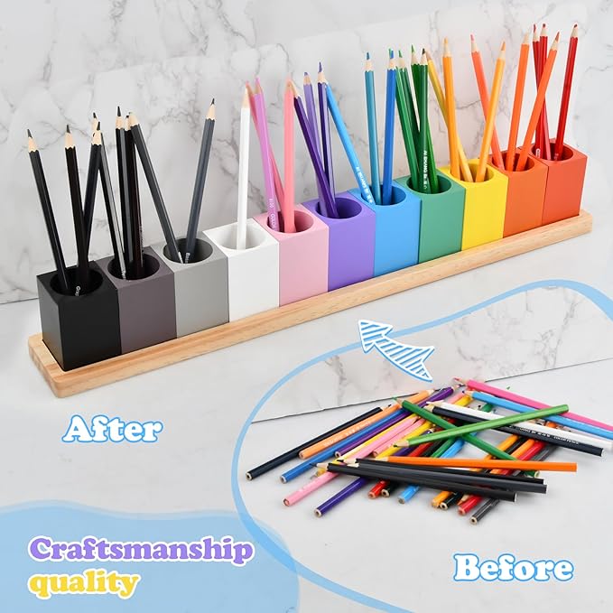 - 【11 Bright Color-Coded Compartments】As a desk pen holder, it features 11 removable rainbow color matching slots. The special design helps kids easily sort and return their pencils while learning colors, encouraging playful learning and developing spatial organization skills