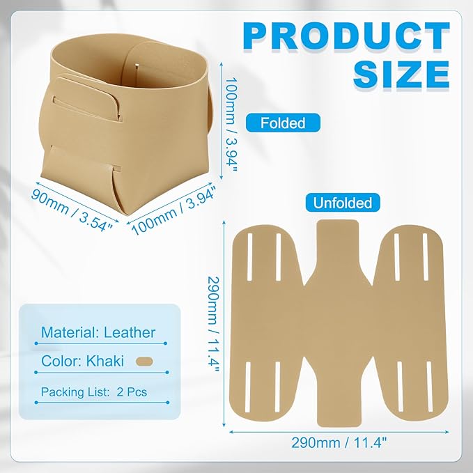 - Specifications: Material: Leather; Color: Khaki; Size: 100 x 100 x 90mm / 3.94 x 3.94 x 3.54 inch ( L * W * H ); Unfolded Length: 290mm / 11.4 Inches; Packing List: 2 x Leather Desk Organizer