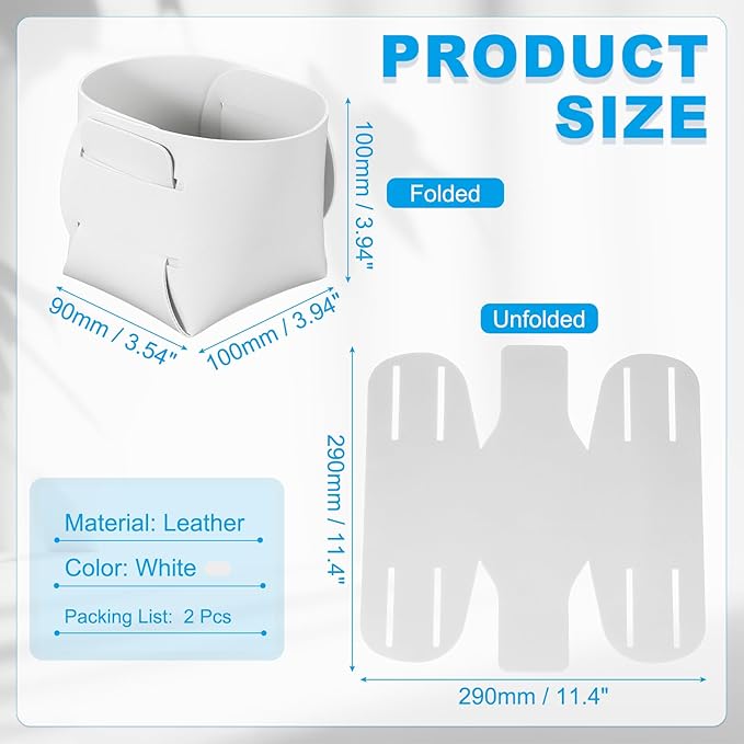 - Specifications: Material: Leather; Color: White; Size: 100 x 100 x 90mm / 3.94 x 3.94 x 3.54 inch ( L * W * H ); Unfolded Length: 290mm / 11.4 Inches; Packing List: 2 x Leather Desk Organizer