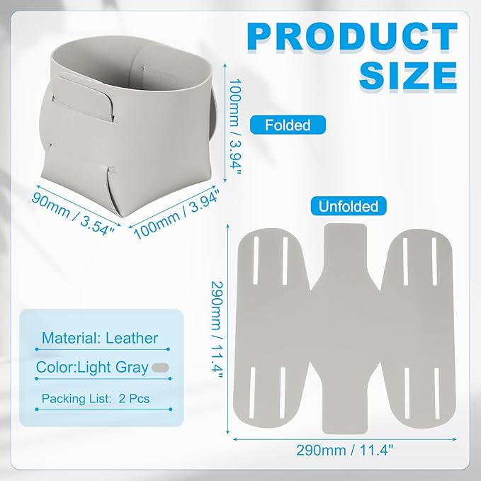 - Specifications: Material: Leather; Color: Light Gray; Size: 100 x 100 x 90mm / 3.94 x 3.94 x 3.54 inch ( L * W * H ); Unfolded Length: 290mm / 11.4 Inches; Packing List: 2 x Leather Desk Organizer