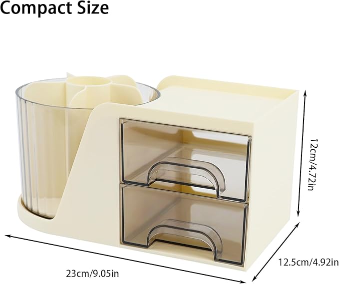 Desk Organizer with Rotating Pencil Pen Holder and 2 Small Drawers, Desk Caddy for Office Workspace Organization and Storage (Beige)