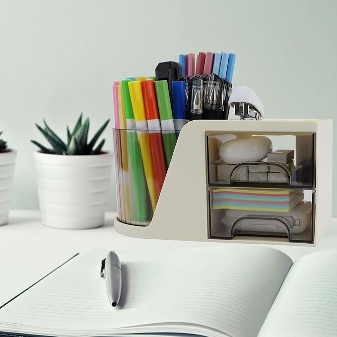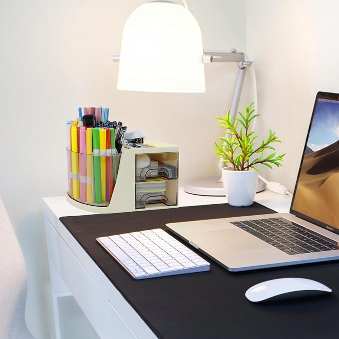- Multifunctional Desk Organizer - This desktop organizer combines a rotating pen holder with drawer storage functionality. Compact and practical, it serves as an excellent helper for organizing your office desk, promotes a neat and organized workspace, improving working efficiency. In addition to serving as an office supply organizer, it also makes an excellent storage solution for makeup brushes on the vanity.