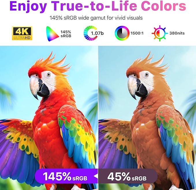 - Sharp 4K Visuals with High Color Accuracy: Experience stunning detail with a 4K UHD portable monitor featuring 145% sRGB, 1.07B colors, and a 1500:1 contrast ratio. Designed for creators, gamers, and professionals who demand precision and vibrant, lifelike color performance.