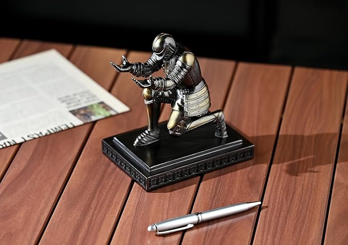 - DESK ORGANIZERS: The pen is mightier than the sword! Executive Knight Pen Holder is a bowing knight, hands raised to hold your most powerful weapon: cool pens.