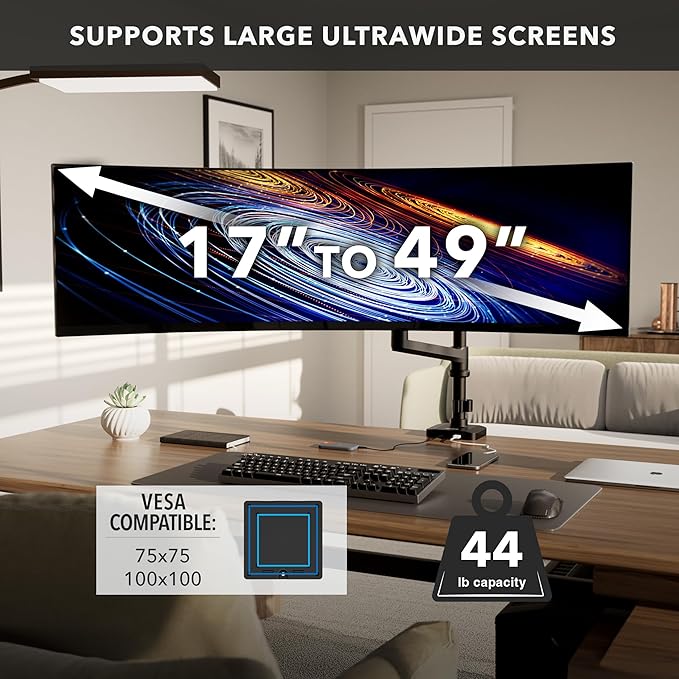 - Built strong for ultrawide monitors – Heavy-duty steel and aluminum construction supports up to 44 lbs with reinforced joints for stability, perfect for wide curved displays like the 49” class.
