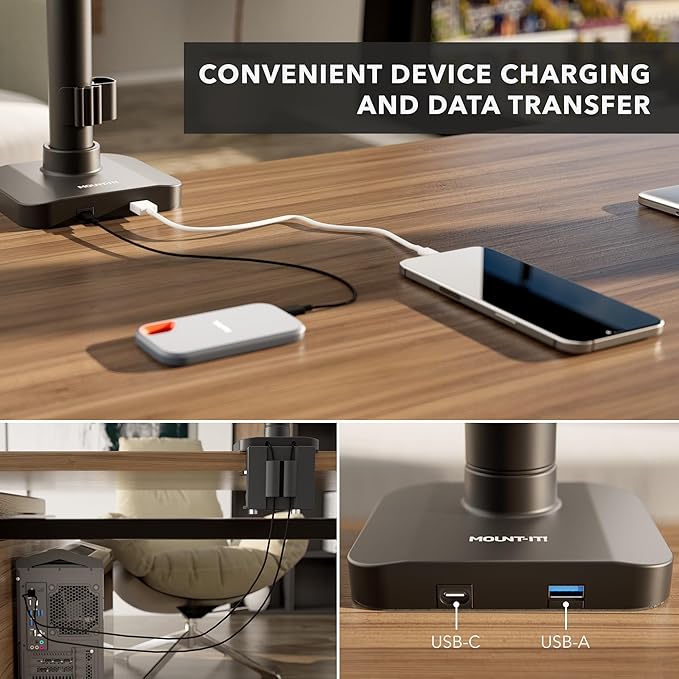 Mount-It! Proflex Series Height-Adjustable Ultrawide Monitor Arm with Pole, Fits 17–49” Screens, Gas Spring, 44 lbs Capacity, USB-C & USB 3.0 Ports, Full Motion, VESA 75/100, Clamp or Grommet