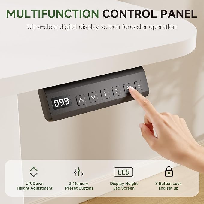 - Intuitive LED Control Panel: The adjustable standing desk features an LED display with three memory presets for fast, precise height adjustments. Supported by a sturdy T-shaped steel frame, this computer desk holds up to 176 lbs, providing stable performance