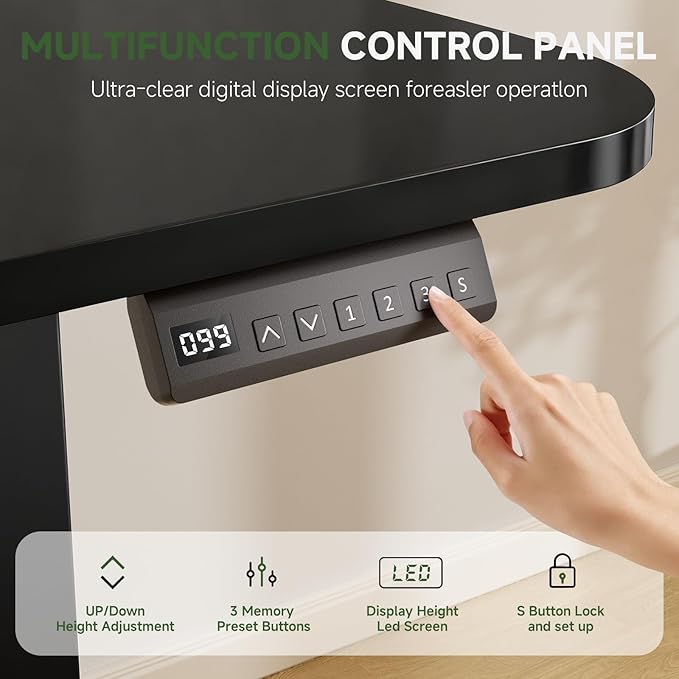 - Intuitive LED Control Panel: The adjustable standing desk features an LED display with three memory presets for fast, precise height adjustments. Supported by a sturdy T-shaped steel frame, this computer desk holds up to 176 lbs, providing stable performance