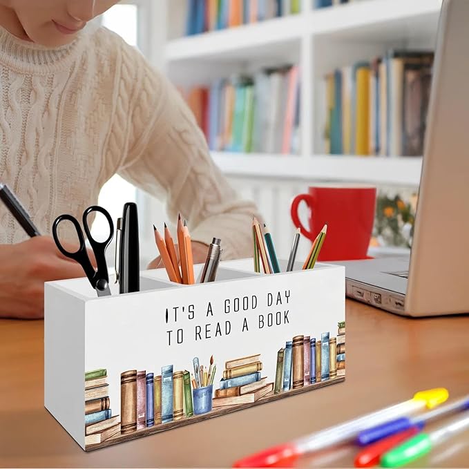 Book Lover Gifts Pen Pencil Holder Organizer for Desk Accessories, Reading Nook Corner Decor, It's a Good Day to Read a Book Wooden Box Signs Decorations for Home Classroom Desk Tabletop