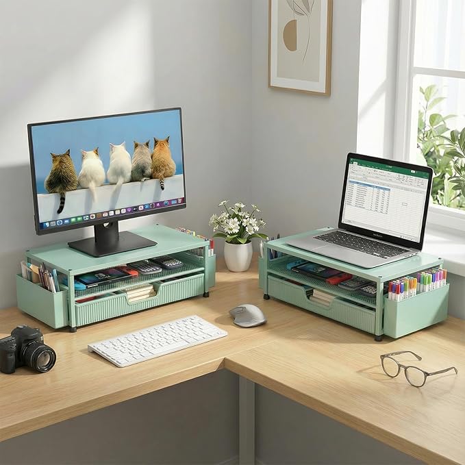 Desk Organizer and Accessories, 2-Tier Computer Monitor Stand Rise with Storage Drawer & 2 Pen Holders, Laptop & Printer Stand for Desktop, Workspace Organizers for Office Supplies (Green)