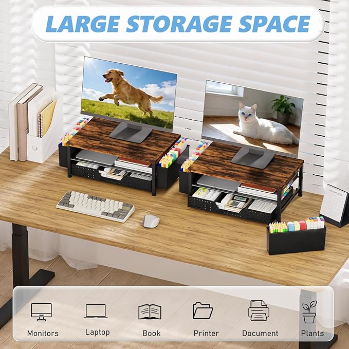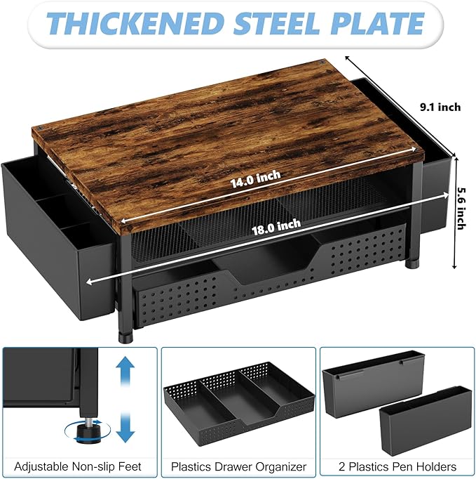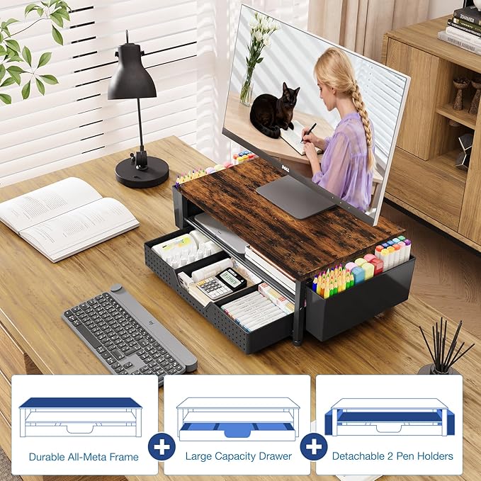 - 【Save Space】:This 2-Tier monitor stand with drawer and 2 hanging pen holders provides ample storage space to keep your office supplies and office desk accessories neatly organized and easily accessible, keeping your workspace tidy and improving your sense of well-being