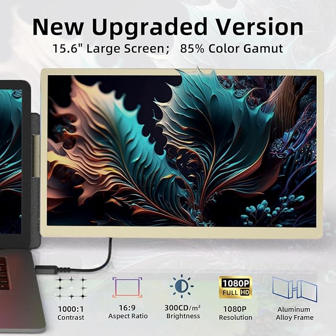 - 15.6" Large Screen: The laptop screen extender has been upgraded to a 15.6" large display with 85% color gamut, FHD 1080P, 300 nits brightness, IPS, providing a broader viewing, richer colors, and a more comfortable viewing experience. Also, through the multi-functional buttons, you can customize the contrast, brightness, volume, and other parameters of each screen to suit your preferences.