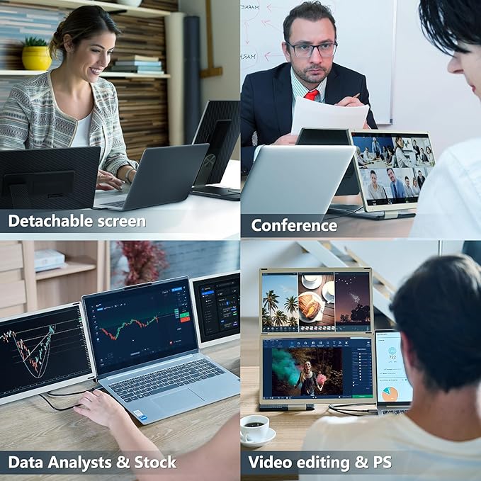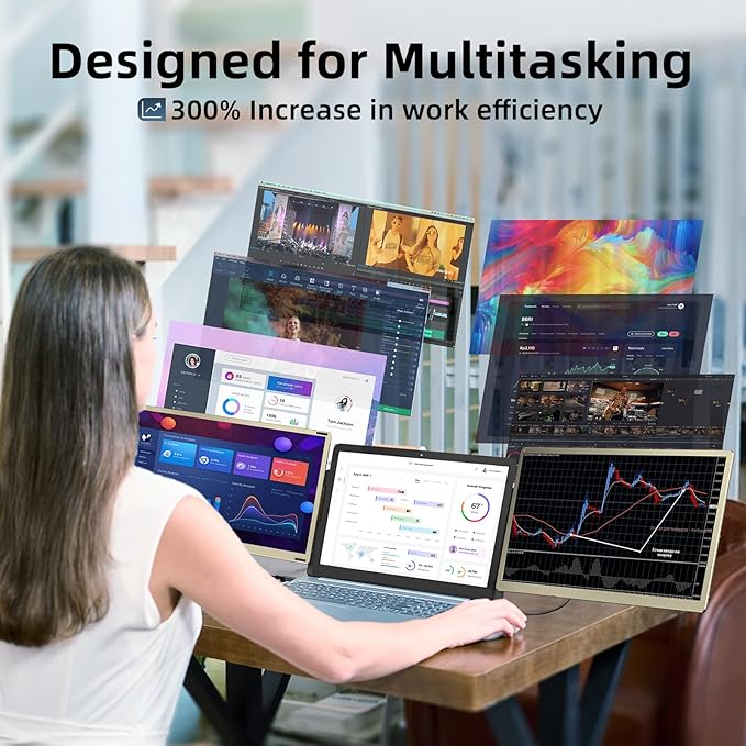 - Improve Efficiency & Magnetic Storage: The portable monitor supports both mirrored and extended modes, eliminating the need to constantly switch windows on a single laptop screen and allowing you to multitask across multiple displays, boosting work efficiency by up to 300%. Perfect choice for remote workers, IT professionals, stock traders. The magnetic storage design securely fastens the screen and parts together, preventing damage to the screen when carrying the screen extender on the go.