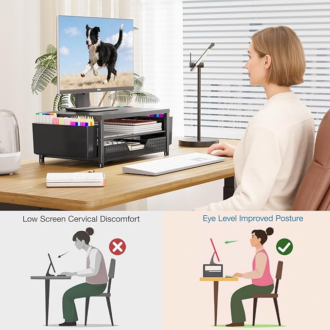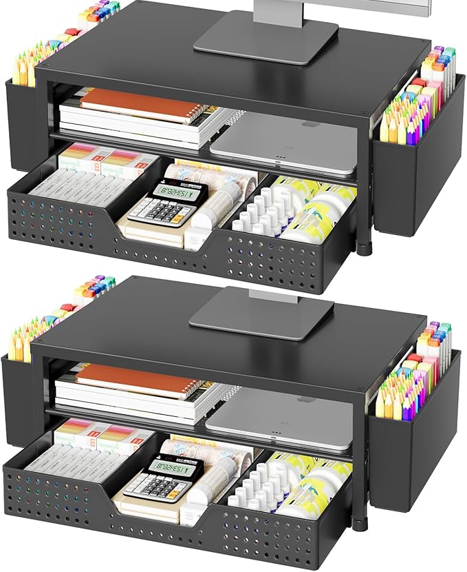 - 【Save Space】:This 2-Tier monitor stand with drawer and 2 hanging pen holders provides ample storage space to keep your office supplies and office desk accessories neatly organized and easily accessible, keeping your workspace tidy and improving your sense of well-being