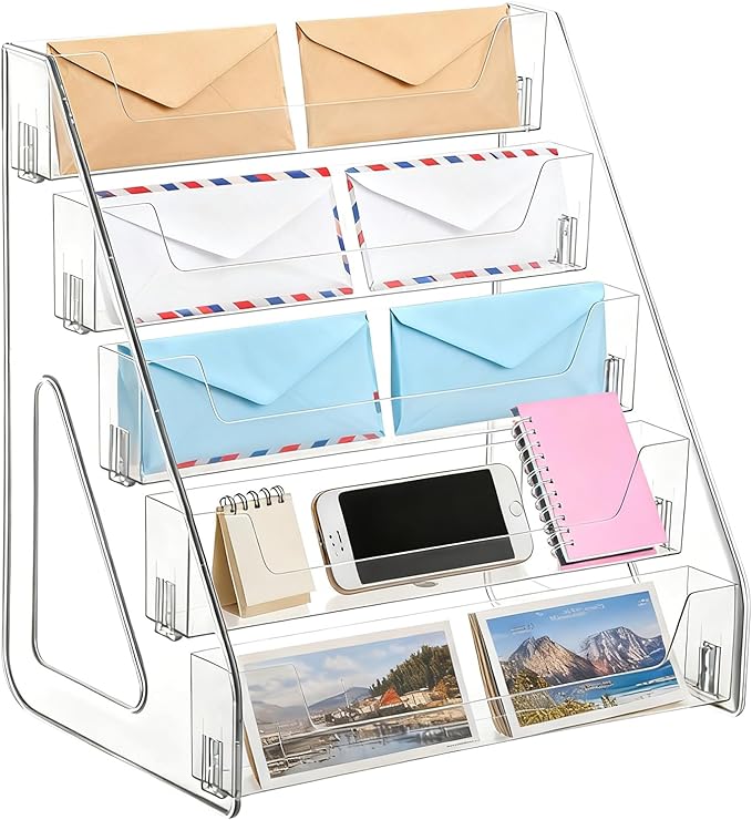 5-Tier Mail Organizer Countertop Laddered Acrylic File Mail Desktop Organizer Sorters Clear Letter Holder Multifunctional Desk File Storage Holders Envelope Folder Racks for Office Home School
