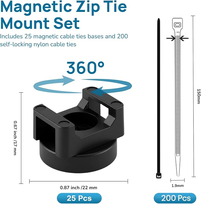 - Ample Set & Strong Load Capacity: Includes 25 magnetic cable ties bases and 200 self-locking nylon cable ties (150mm x 2mm). Each magnetic zip tie mounts (22mm diameter) can hold up to 12 lbs of vertical pull, flexible positioning and reusable