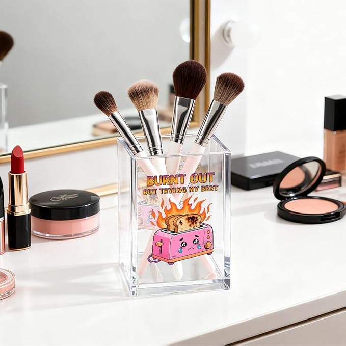 Burnt out Acrylic Cosmetic Organizer Pen Holder, Funny Optimistic Acrylic Desk Holder Cup for Pen Pencil, Humorous Office Gifts for Coworker Director Mentor, Mental Health Gifts for Hard Worker
